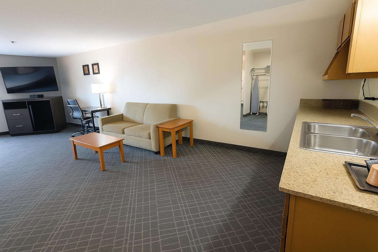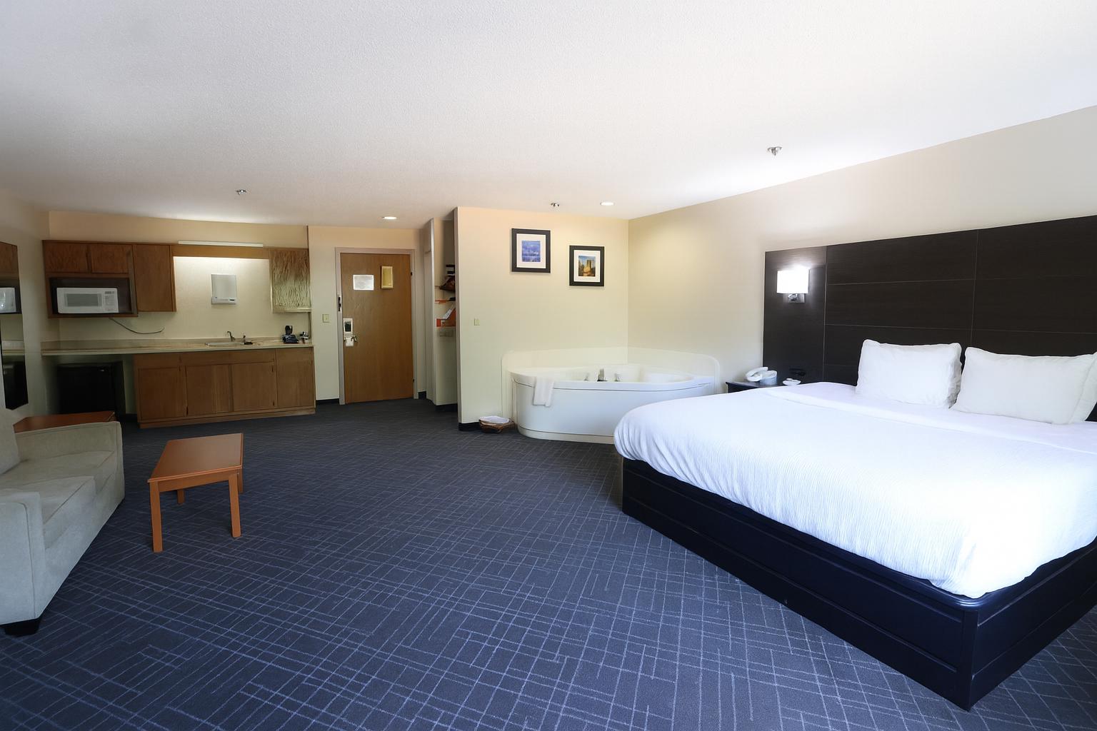 Guest room equipped with a tub and kitchenette amenities.