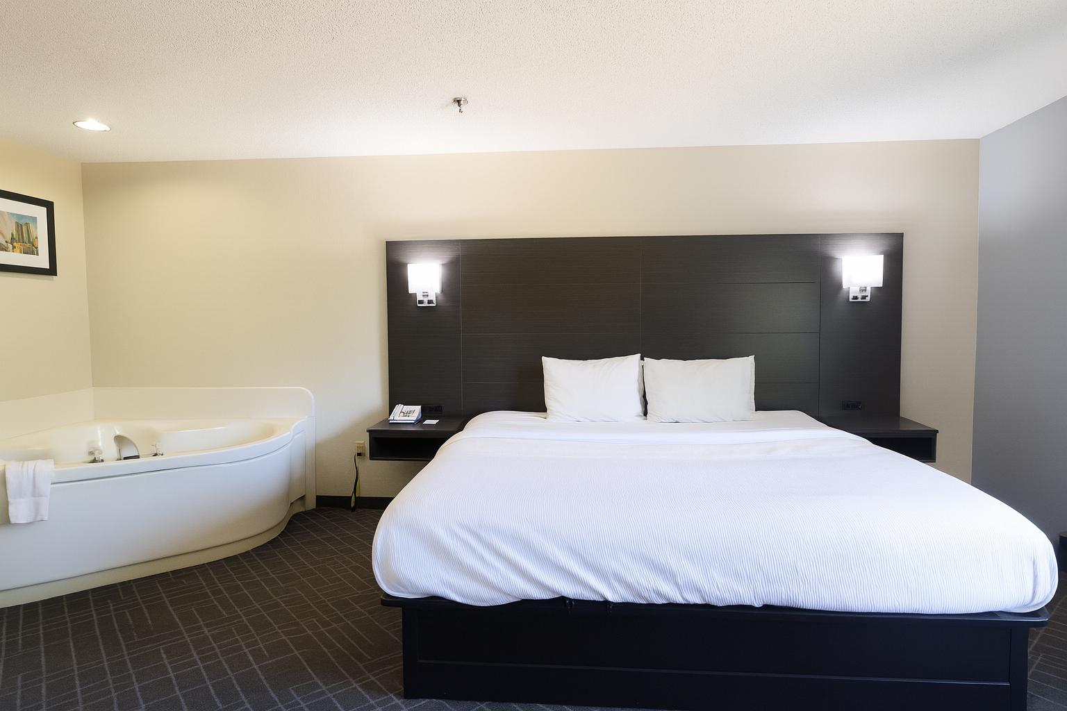 Spacious guest room featuring a relaxing bathtub.